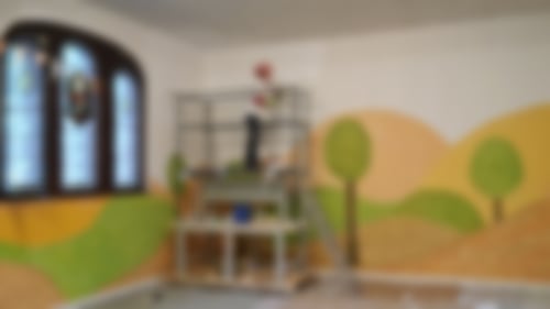 Als die Mieter auszogen, breitete sich der Kindergarten in den ersten Stock aus und bekam einen neuen Turnraum in der ehemaligen Kapelle. Der gute Eichenfußboden wurde mit Turnboden beklebt. Alle Kindergartenräume, auch die Kapelle wurden mit Kindergartenmotiven bemalt. Klosterküche und Hostienbäckerei wurden als ausgeschlachtet und zu Abstellkammern degradiert. | ![]() | |